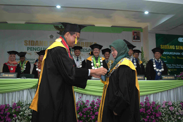 PARIST.ID, Kudus - Raut wajah bahagia terpancar dari Prof. Dr. Hj. Umma Farida, Lc., M.A saat dikukuhkan sebagai Guru Besar dalam Bidang Ilmu Hadis, Fakultas Ushuluddin IAIN Kudus. Uniknya, pengukuhan yang berlangsung pada Jumat (10/2) dikukuhkan oleh Suaminya, Prof. Dr. H. Abdurrahman Kasdi, Lc,. M.Si sekaligus Rektor IAIN Kudus.